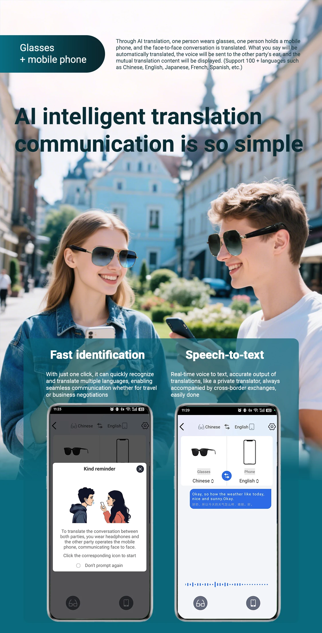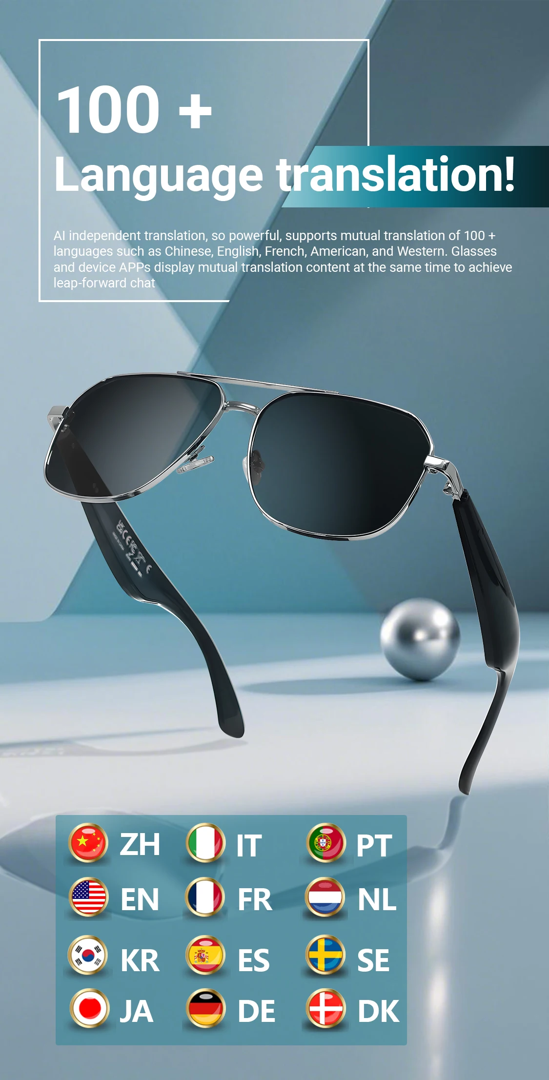 AI Intelligent Translation Glasses,Support 100+ Language Translate,Remote Camera,Play Songs,Answer Call,Reject Call,Voice Assistant,Anti-ultraviolet